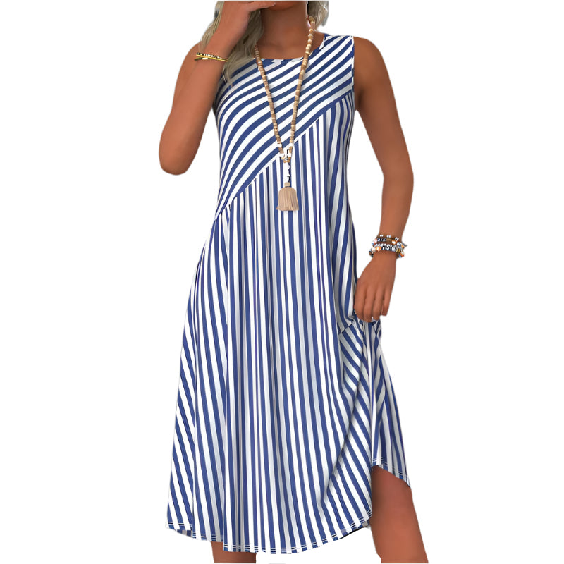 Das Judika – Klassisch Gestreifte Kleid vereint stilvolle Schlichtheit mit femininer Silhouette. Die feinen Streifen verleihen dem Kleid eine zeitlose Note, während der bequeme Schnitt für angenehmen Tragekomfort sorgt. Ob am Strand, beim Stadtbummel oder im Büro – dieses Kleid ist ein echter Allrounder für warme Tage mit Stil.